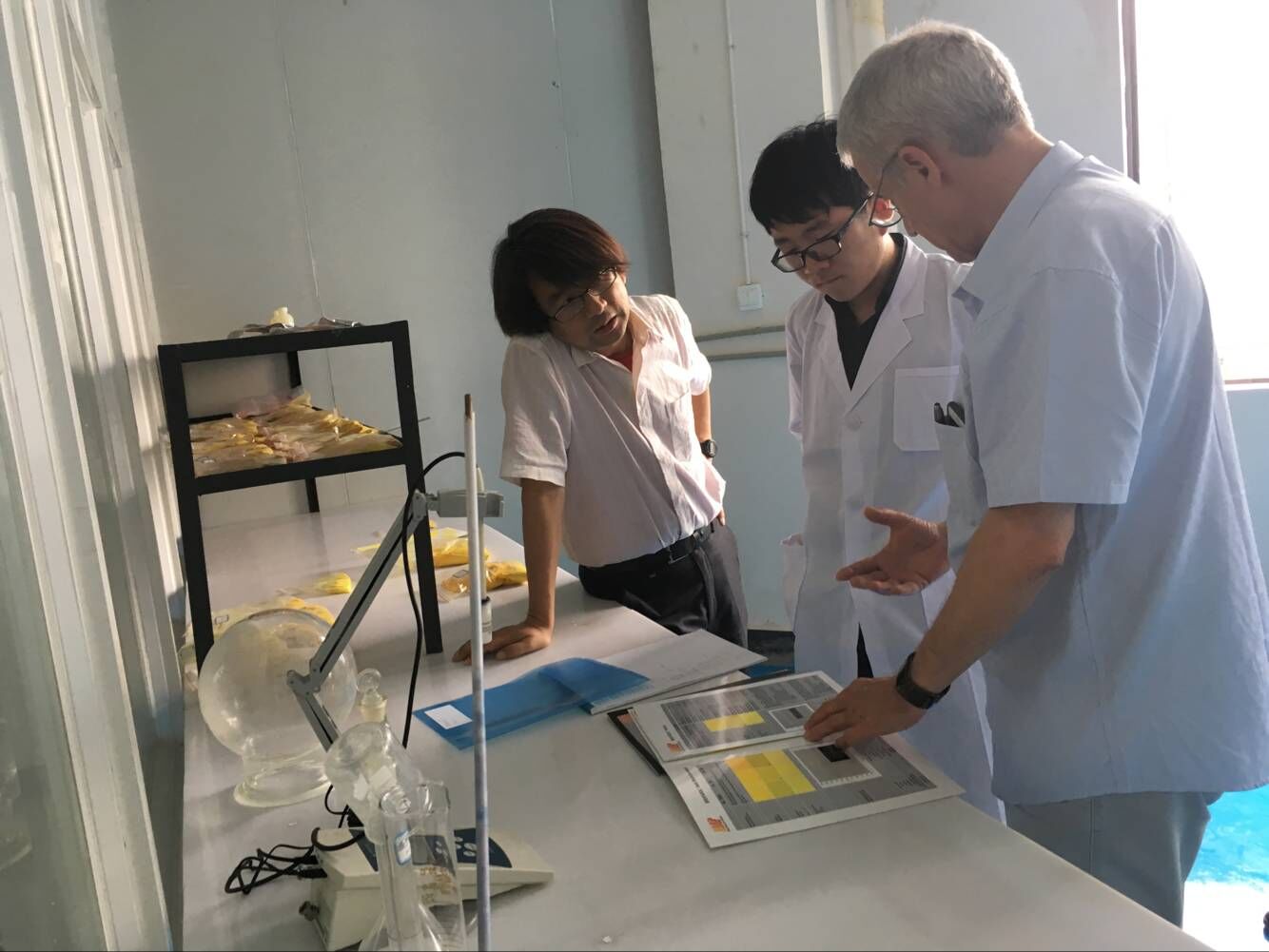 德國FALCONE公司總經(jīng)理Rudolf Gitzelmann與云南鐵坦董事長(cháng)就合作生產(chǎn)工作進(jìn)行座談。雙方交流了各自公司的基本信息,生產(chǎn)經(jīng)營(yíng)及技術(shù)情況,商討有關(guān)復合無(wú)機環(huán)保顏料的合作事宜。合談完畢,Rudolf Gitzelmann一行兩人在云南鐵坦董事長(cháng)的陪同下參觀(guān)了云南鐵坦的實(shí)驗室,Rudolf Gitzelmann詳細了解了云南鐵坦現有的實(shí)驗規模,產(chǎn)品種類(lèi)和技術(shù)發(fā)展情況。在產(chǎn)品原料展示架前,Rudolf Gitzelmann對云南鐵坦現有實(shí)驗技術(shù)和產(chǎn)品表示出濃烈的興趣,并予以肯定,最后還現場(chǎng)指導實(shí)驗人員,講解德國FALCONE公司的技術(shù)。