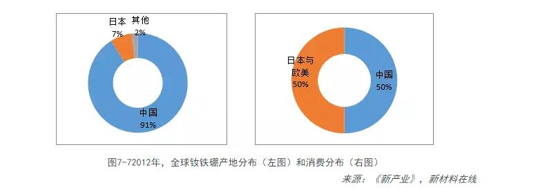 以2012年為例,中國稀土永磁材料產(chǎn)量占全球產(chǎn)量的91%,日本產(chǎn)量約占7%,日本以日立金屬為主,其他地區僅占2%,釹鐵硼的生產(chǎn)極為集中。下游消費市場(chǎng)看,中國消費了約50%的釹鐵硼,歐美、日本等地區消費了50%左右。主要原因是釹鐵硼主要應用于消費電子、風(fēng)機、汽車(chē)等領(lǐng)域,而我國是上述產(chǎn)品的生產(chǎn)制造大國。