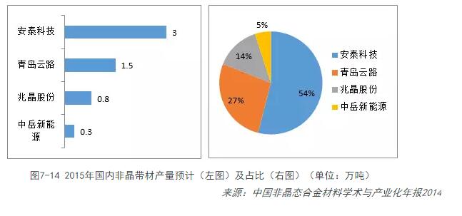 由于非晶帶材技術(shù)壁壘非常高,目前全世界僅有安泰科技和日本日立金屬、青島云路等少數企業(yè)能夠生產(chǎn),特別是日立金屬,占據了國內63%的市場(chǎng)。以2014年為例,日立金屬生產(chǎn)的非晶帶材達到9萬(wàn)噸,其中中國銷(xiāo)售4萬(wàn)噸,印度銷(xiāo)售為2萬(wàn)噸,其余在日本本土、美國、東南亞市場(chǎng)銷(xiāo)售為3萬(wàn)噸。國內非晶帶材的生產(chǎn)企業(yè)除了安泰科技和青島云路,還有兆晶股份、中岳新能源等企業(yè)。