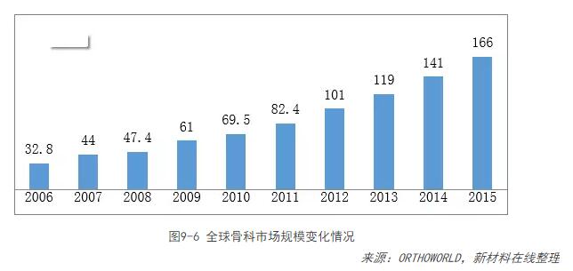 根據ORTHOWORLD的統計,2006年全球骨科市場(chǎng)規模為288億美元,2012年增加至431億美元。預計2012-2015年全球市場(chǎng)整體維持3.1%的年復合增長(cháng)率,到2015年全球市場(chǎng)規模達472億美元。