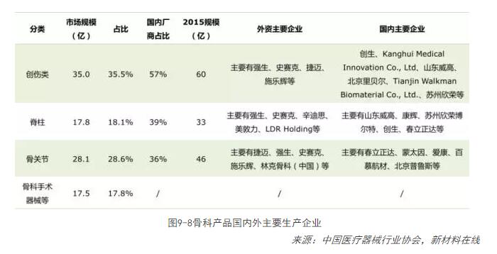 目前,關(guān)節類(lèi)、創(chuàng )傷類(lèi)和脊柱類(lèi)是中國骨科醫療器械三大主流類(lèi)別產(chǎn)品,創(chuàng )傷類(lèi)是唯一一類(lèi)沒(méi)有被國外廠(chǎng)商主導的產(chǎn)品。2012年11月16日,美敦力正式宣布,出資8.16億美元收購康輝公司,兩個(gè)月后,美國史賽克公司宣布收購位于常州的骨科產(chǎn)品生產(chǎn)商創(chuàng )生公司。隨著(zhù)老齡化到來(lái),骨關(guān)節將是未來(lái)增速最快的領(lǐng)域。