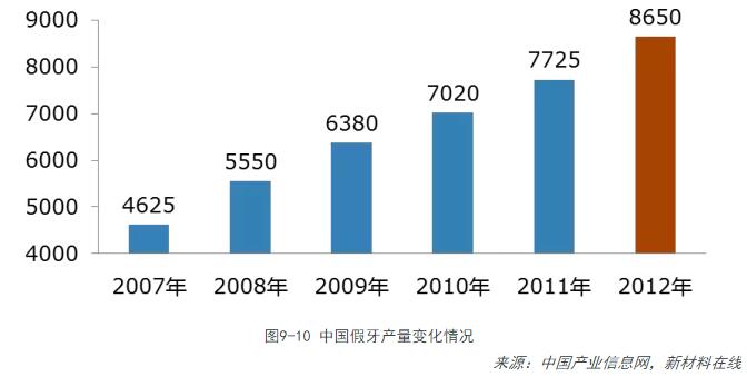 根據DENSPLY公司的估計,全球齒科產(chǎn)品市場(chǎng)約為180億美元,其中材料大概占60%份額。2012年中國假牙產(chǎn)量為8650萬(wàn)顆,占全球60%,預計到2030年,中國牙科材料市場(chǎng)將達120億人民幣。