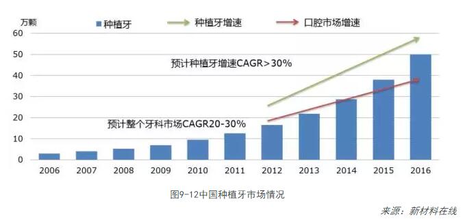 根據中國牙科工業(yè)品市場(chǎng)分布情況看,義齒材料占比穩定,份額最大,而種植牙比重呈持續增加。未來(lái)牙科工業(yè),應重點(diǎn)關(guān)注植入材料和陶瓷材料。2012年,中國年種植體植入量約20萬(wàn)顆,和韓國100萬(wàn)顆及其他周邊國家、地區比,尚有不小的發(fā)展空間。龐大的人口基數,使中國有成為最大的口腔種植市場(chǎng)的潛力。預計到2016年,中國種植牙數量有望上升到50萬(wàn)顆以上,年復增長(cháng)率在30%以上。